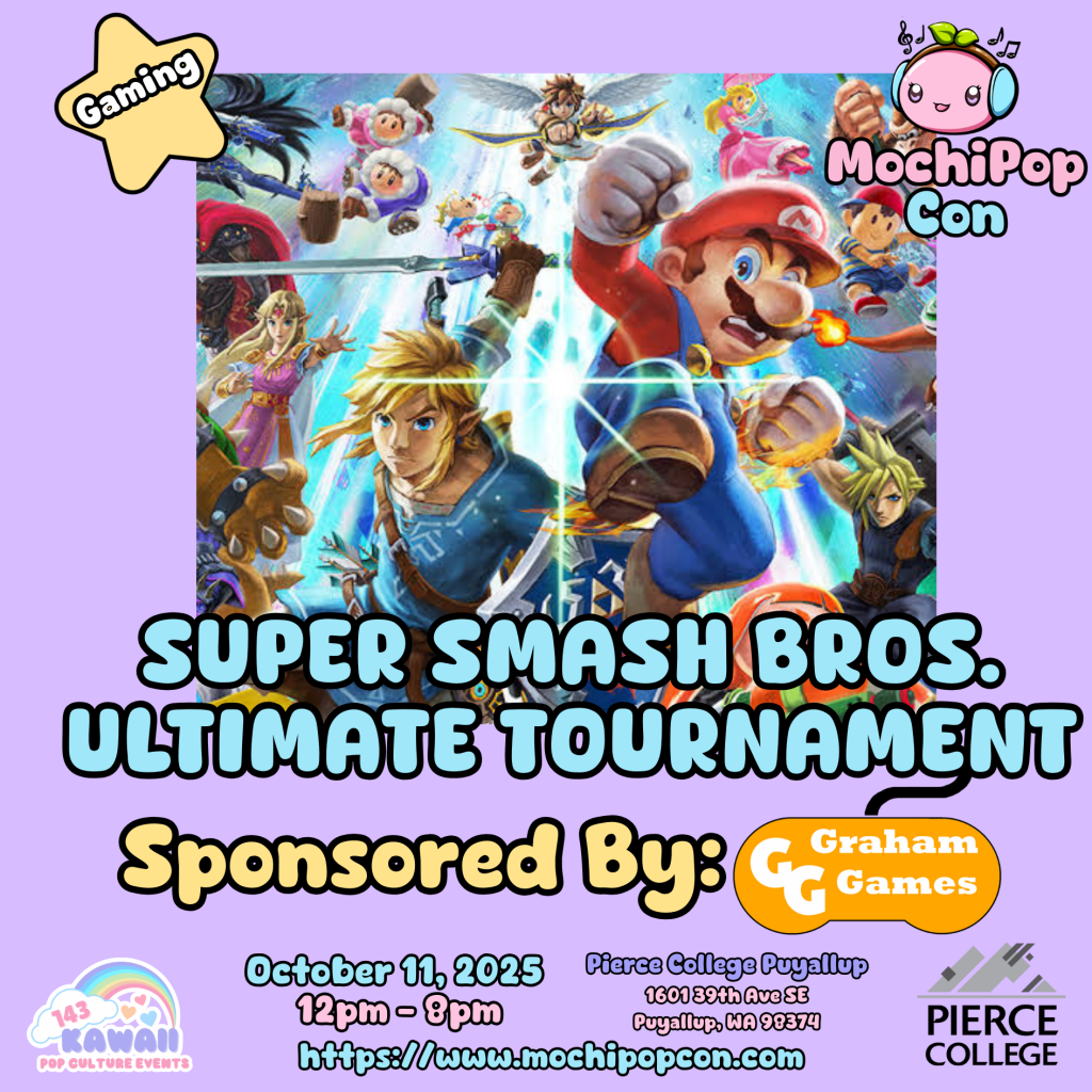 The Super Smash Bros. Ultimate Tournament is happening at MochiPop Con 2025, sponsored by Graham Games!